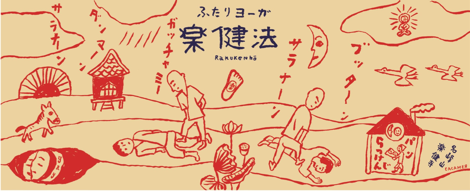 イラストは楽健法の本の挿絵をしているささめやゆき画。賑やかで健やかな気持ちになるてぬぐいです。